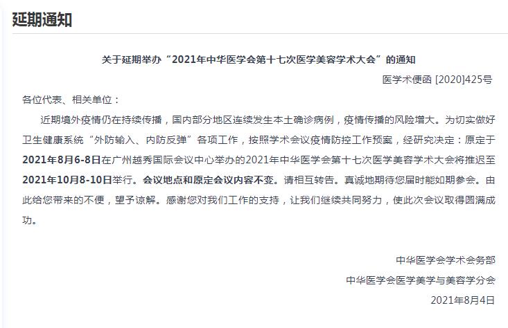 近期境外疫情仍在持續(xù)傳播,國(guó)內(nèi)部分地區(qū)連續(xù)發(fā)生本土確診病例,疫情傳播的風(fēng)險(xiǎn)增大。為切實(shí)做好衛(wèi)生健康系統(tǒng)“外防輸入、內(nèi)防反彈”各項(xiàng)工作,按照學(xué)術(shù)會(huì)議疫情防控工作預(yù)案,經(jīng)研究決定:原定于2021年8月6-8日在廣州越秀國(guó)際會(huì)議中心舉辦的2021年中華醫(yī)學(xué)會(huì)第十七次醫(yī)學(xué)美容學(xué)術(shù)大會(huì)將推遲至2021年10月8-10日舉行。會(huì)議地點(diǎn)和原定會(huì)議內(nèi)容不變。請(qǐng)相互轉(zhuǎn)告。真誠(chéng)地期待您屆時(shí)能如期參會(huì)。由此給您帶來的不便,望予諒解。感謝您對(duì)我們工作的支持,讓我們繼續(xù)共同努力,使此次會(huì)議取得圓滿成功。