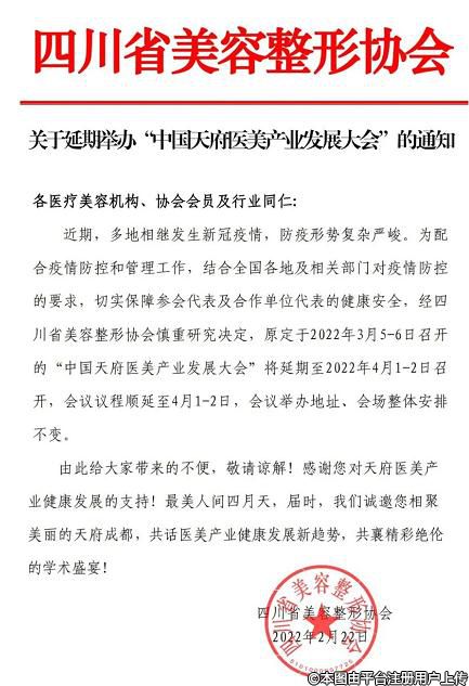 因?yàn)橐咔榈挠绊?,為了配合疫情防控和管理工作,原定?月5日-6日召開的中國(guó)天府醫(yī)美產(chǎn)業(yè)發(fā)展大會(huì),延期至4月1日-2日召開,屆時(shí)將邀請(qǐng)行業(yè)行業(yè)學(xué)術(shù)醫(yī)師、機(jī)構(gòu)嘉賓代表、平臺(tái)嘉賓代表以及業(yè)內(nèi)人士,一同共話醫(yī)美產(chǎn)業(yè)健康發(fā)展新趨勢(shì),期待這一次精彩絕倫的學(xué)術(shù)盛宴!