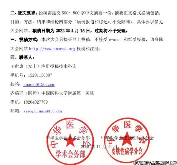 年會(huì)歷來重視廣大醫(yī)師積極主動(dòng)參與,重視稿件的征集。學(xué)會(huì)將繼續(xù)在自由投稿中遴選出“基礎(chǔ)研究”和“臨床研究”的高質(zhì)量論文各10篇,給予免下屆年會(huì)注冊費(fèi)鼓勵(lì)。年會(huì)堅(jiān)持學(xué)術(shù)開放和爭鳴的辦會(huì)理念,特向全國皮膚科醫(yī)師征集學(xué)術(shù)演講者。為保證完成相關(guān)的學(xué)術(shù)交流內(nèi)容,演講者采取特邀和自薦結(jié)合的方式,邀請全國皮膚科專家主動(dòng)申請參與各個(gè)相應(yīng)欄目的交流,歡迎全國從事皮膚性病工作的醫(yī)生、研究人員、研究生和護(hù)師(士)等踴躍投稿并積極參會(huì),特別鼓勵(lì)中青年醫(yī)師和基層醫(yī)院醫(yī)師的主動(dòng)參與。