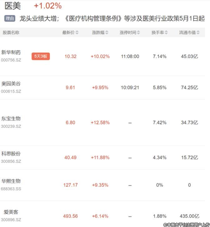 4月26日早間,醫(yī)美板塊多股拉升,新華制藥、奧園美谷(疊加房地產(chǎn))漲停,東寶生物漲超12%,華熙生物、愛爾眼科、愛美客等大漲。