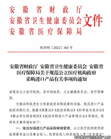 此次安徽是動真格了,直接提前法出通知,明確提出,公立醫(yī)療機構使用財政預算資金以及事業(yè)收入、經(jīng)營性收入和其他收入等“自有資金”開展采購活動,應當嚴格執(zhí)行政府采購關于進口審核的有關規(guī)定。單項或批量采購預算達到政府采購分散采購限額標準,確需采購進口產(chǎn)品的,實行審核管理。