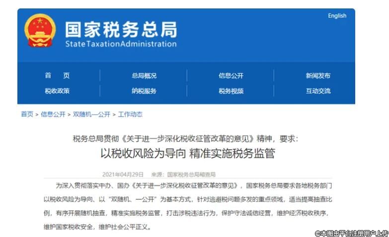 據(jù)了解,早在2021年4月29日,國家稅務(wù)總局官網(wǎng)發(fā)布《稅務(wù)總局貫徹精神,要求以稅收風(fēng)險為導(dǎo)向 精準實施稅務(wù)監(jiān)管》,要求各地稅務(wù)部門針對逃避稅問題多發(fā)的重點領(lǐng)域,適當提高抽查比例,有序開展隨機抽查,精準實施稅務(wù)監(jiān)管,打擊涉稅違法行為。