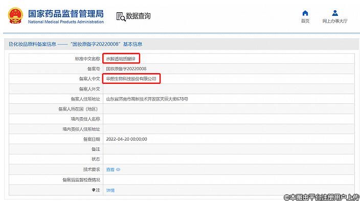 化妝品原料備案平臺(tái)信息顯示,水解透明質(zhì)酸鋅新原料的備案號(hào)為國(guó)妝原備字20220008,備案日期顯示為2022年4月20日。