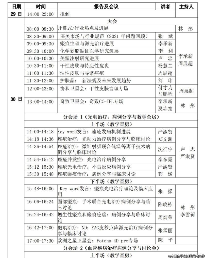 本次會議采取線下線上兩種形式同時進(jìn)行,將邀請國內(nèi)相關(guān)領(lǐng)域的臨床一線專家就國內(nèi)外最新進(jìn)展進(jìn)行專題報告和交流。本次年會在大會的基礎(chǔ)上,另設(shè)立六個臨床病例分享及教學(xué)查房分會場:光電治療(激光與光子)、光電治療(其它能量) 、血管疾病治療、埋置線技術(shù)、損容性皮膚病、微整形注射,以教學(xué)查房和病例分享為主線,分享臨床經(jīng)驗、并充分討論臨床中所出現(xiàn)的各種問題。