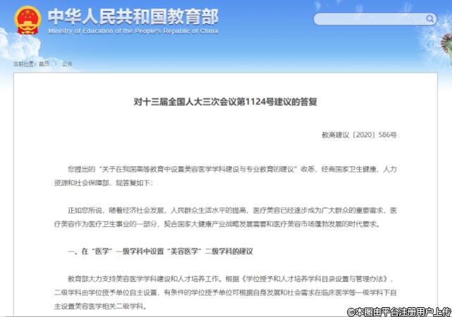《答復(fù)》指出:隨著經(jīng)濟社會發(fā)展,人民群眾生活水平的提高,醫(yī)療美容已經(jīng)逐步成為廣大群眾的重要需求,教育部大力支持美容醫(yī)學(xué)學(xué)科建設(shè)和人才培養(yǎng)工作。