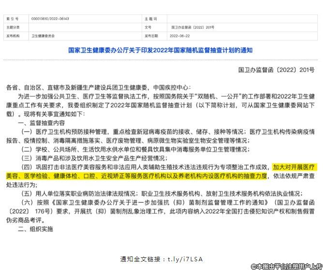 6月22日,國家衛(wèi)生健康委辦公廳印發(fā)2022年國家隨機(jī)監(jiān)督抽查計(jì)劃,監(jiān)督抽查內(nèi)容包括:醫(yī)療衛(wèi)生機(jī)構(gòu)預(yù)防接種管理,重點(diǎn)檢查新冠病毒疫苗的接收、儲(chǔ)存、接種等情況;醫(yī)療衛(wèi)生機(jī)構(gòu)傳染病疫情報(bào)告、疫情控制、消毒隔離措施落實(shí)、醫(yī)療廢物管理、病原微生物實(shí)驗(yàn)室生物安全管理等情況;鞏固打擊非法醫(yī)療美容服務(wù)和非法應(yīng)用人類輔助生殖技術(shù)違法違規(guī)行為專項(xiàng)整治工作成效,加大對開展醫(yī)療美容、醫(yī)學(xué)檢驗(yàn)、健康體檢、口腔、近視矯正等服務(wù)醫(yī)療機(jī)構(gòu)以及養(yǎng)老機(jī)構(gòu)內(nèi)設(shè)醫(yī)療機(jī)構(gòu)的抽查力度,依法依規(guī)嚴(yán)肅查處違法行為。
