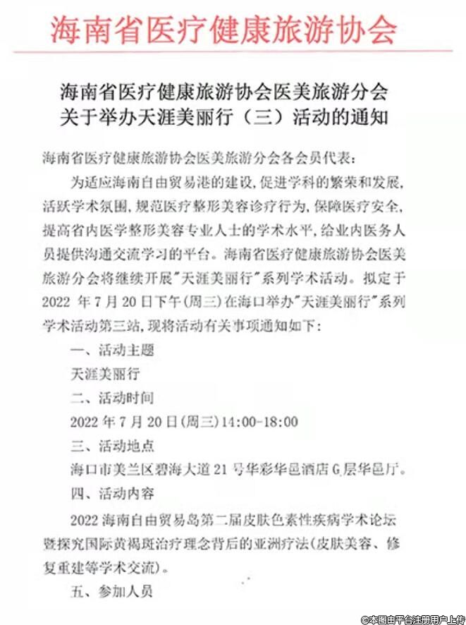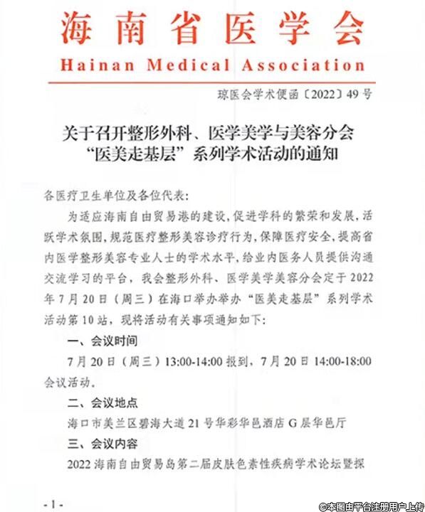 2022年7月20日14:00由海南省醫(yī)學(xué)會(huì)整形外科、醫(yī)學(xué)美學(xué)美容分會(huì)、海南紅瑞集團(tuán)-紅妝尚醫(yī)學(xué)美容連鎖聯(lián)合主辦,海南省醫(yī)療健康旅游協(xié)會(huì)醫(yī)美旅游分會(huì)、海南科伊美生物科技有限公司協(xié)辦的2022海南自由貿(mào)易港第二屆皮膚色素性疾病學(xué)術(shù)論壇。將在??谌A彩華邑G層華邑廳盛大開(kāi)啟。