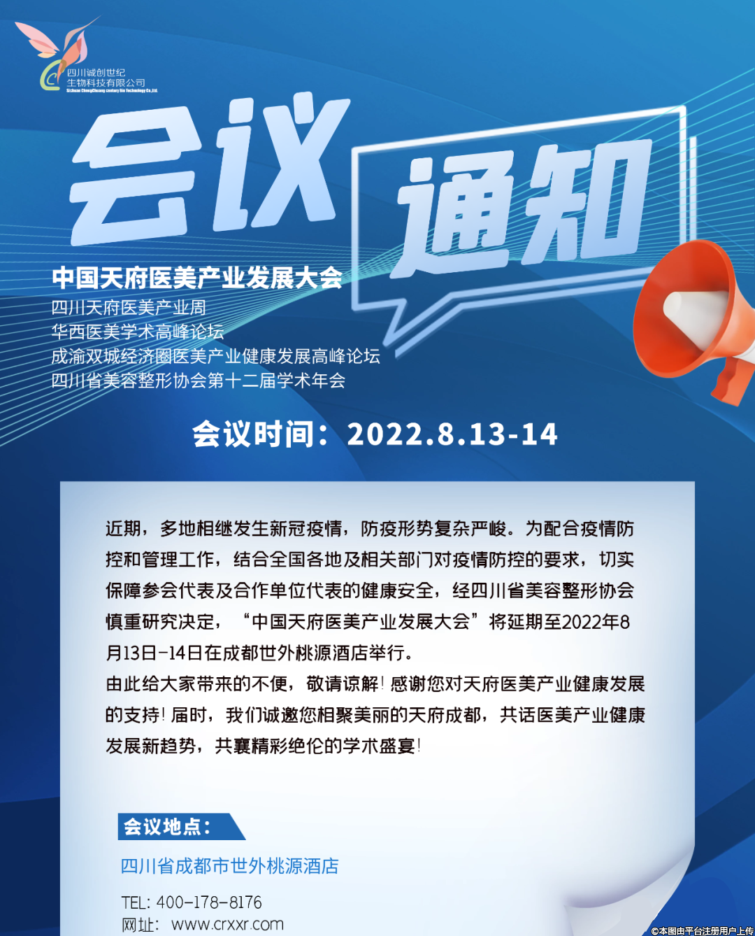 由于現(xiàn)目前全國各地疫情反復,防疫形勢復雜嚴峻,結(jié)合全國各地相關(guān)部門對疫情防控的要求,配合疫情防控工作,【中國天府醫(yī)美產(chǎn)業(yè)發(fā)展大會】將延期至2022年8月13日-14日在成都世外桃源酒店舉行,會場整體安排不變。