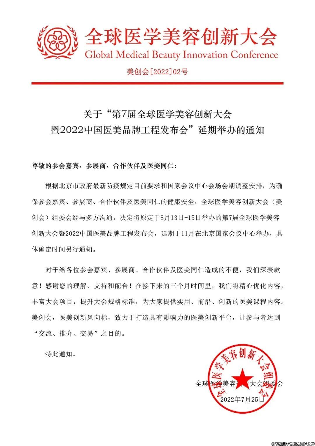 延期通知 第七屆全球醫(yī)學美容創(chuàng)新大會暨2022中國醫(yī)美品牌工程發(fā)布會