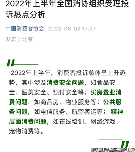 2022年上半年,消費者投訴總體呈.上升態(tài)勢,其中涉及消費安全問題,如食品安全、醫(yī)美安全、預(yù)付安全等;買房置業(yè)消費問題,如商品房、物業(yè)服務(wù)等;公共服務(wù)問題,如電信服務(wù)、航空客運等;精神層面消費問題,如在線培訓(xùn)、網(wǎng)絡(luò)游戲、寵物消費等。