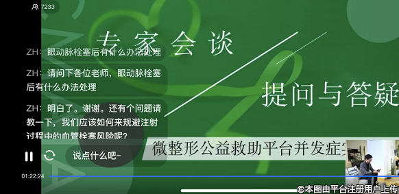 專家會談最后,線上多位聽眾提出了“眼動脈栓塞后有什么辦法處理?”、“應(yīng)該如何來規(guī)避注射過程中的血管栓塞風(fēng)險?”、“肉毒素過敏應(yīng)如何預(yù)防和處理?”等問題,郭波教授結(jié)合實際案例解答了聽眾提出的困惑與問題。