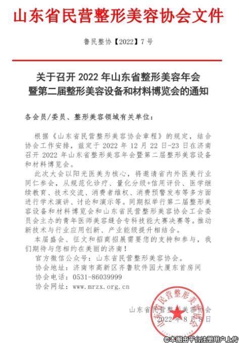 根據(jù)《山東省民營整形美容協(xié)會章程》的規(guī)定,結(jié)合協(xié)會工作安排,茲定于2022年12月22日-23日在濟(jì)南召開2022年山東省整形美容年會暨第二屆整形美容設(shè)備和材料博覽會。