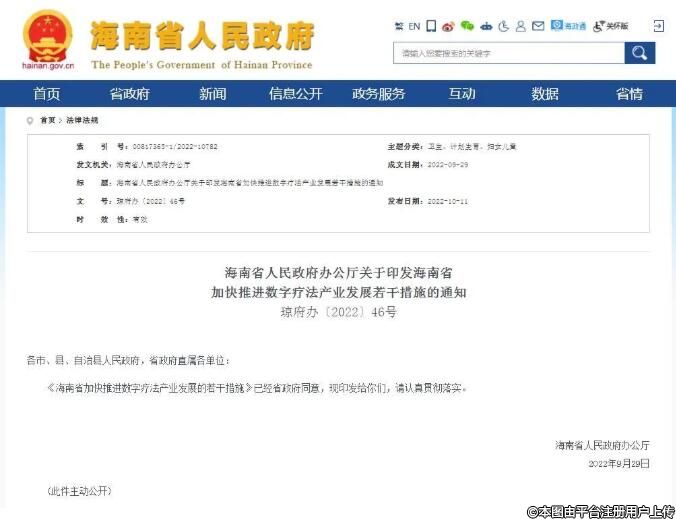 10月11日消息,海南省人民政府辦公廳對外印發(fā)《海南省加快推進數(shù)字療法產(chǎn)業(yè)發(fā)展若干措施》(以下簡稱“《若干措施》”)。
