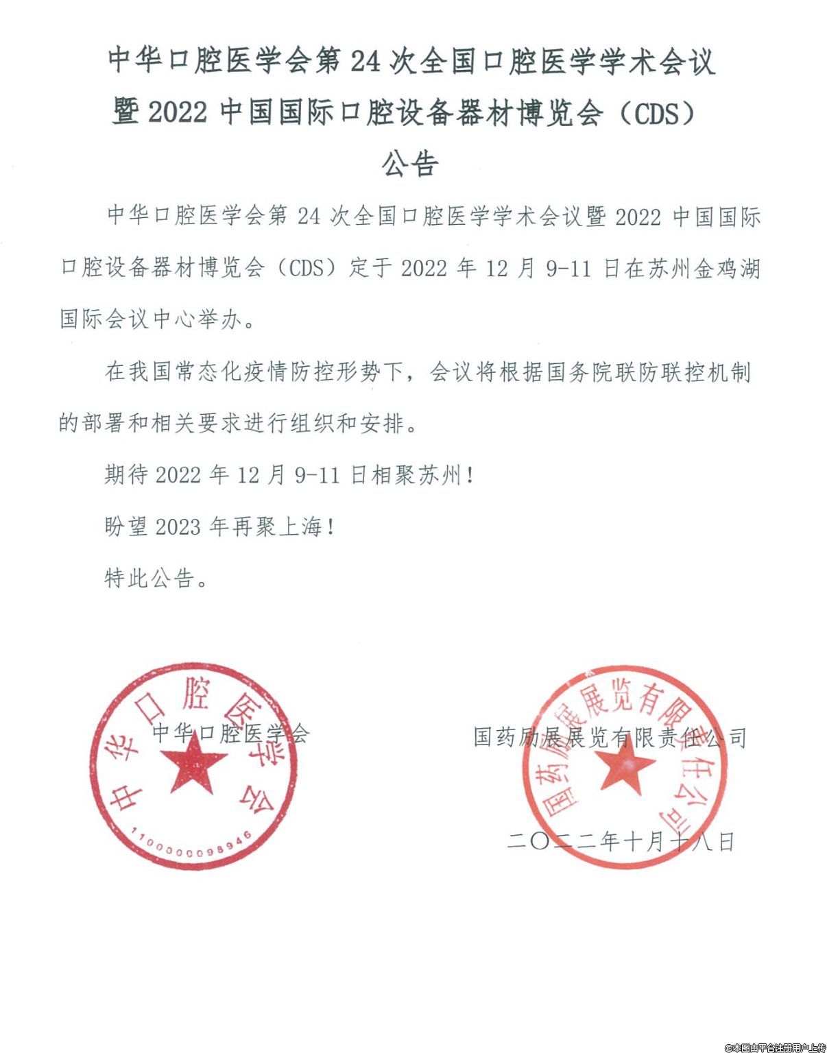 中華口腔醫(yī)學(xué)會(huì)第24次全國(guó)口腔醫(yī)學(xué)學(xué)術(shù)會(huì)議暨2022中國(guó)國(guó)際口腔設(shè)備器材博覽會(huì) "(CDS)公告