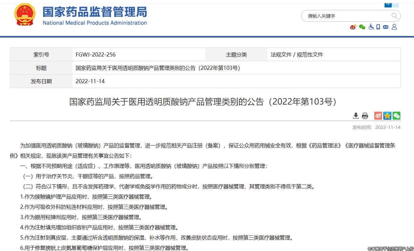 國(guó)家藥監(jiān)局關(guān)于醫(yī)用透明質(zhì)酸鈉產(chǎn)品管理類別的公告(2022年第103號(hào))