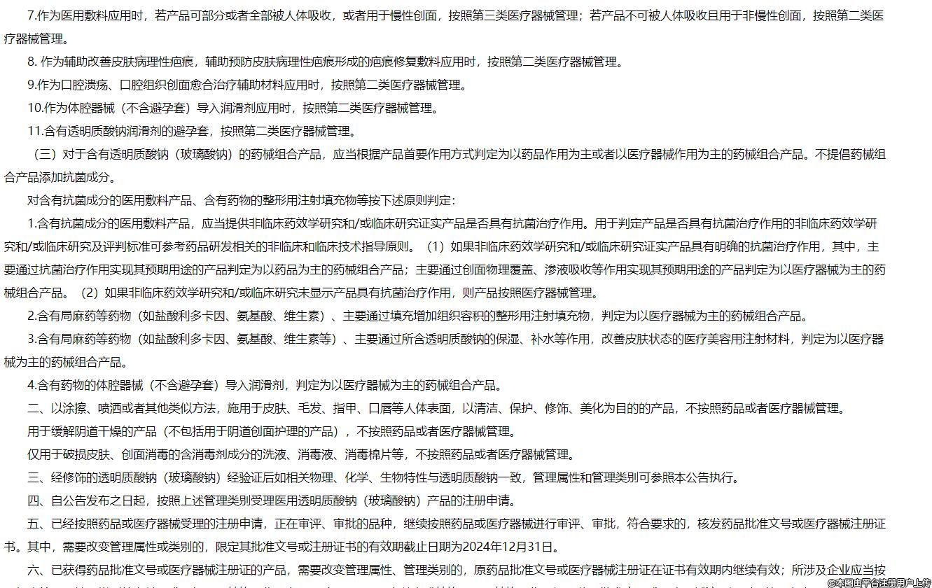 ?。ㄈ?duì)于含有透明質(zhì)酸鈉(玻璃酸鈉)的藥械組合產(chǎn)品,應(yīng)當(dāng)根據(jù)產(chǎn)品首要作用方式判定為以藥品作用為主或者以醫(yī)療器械作用為主的藥械組合產(chǎn)品。不提倡藥械組合產(chǎn)品添加抗菌成分。