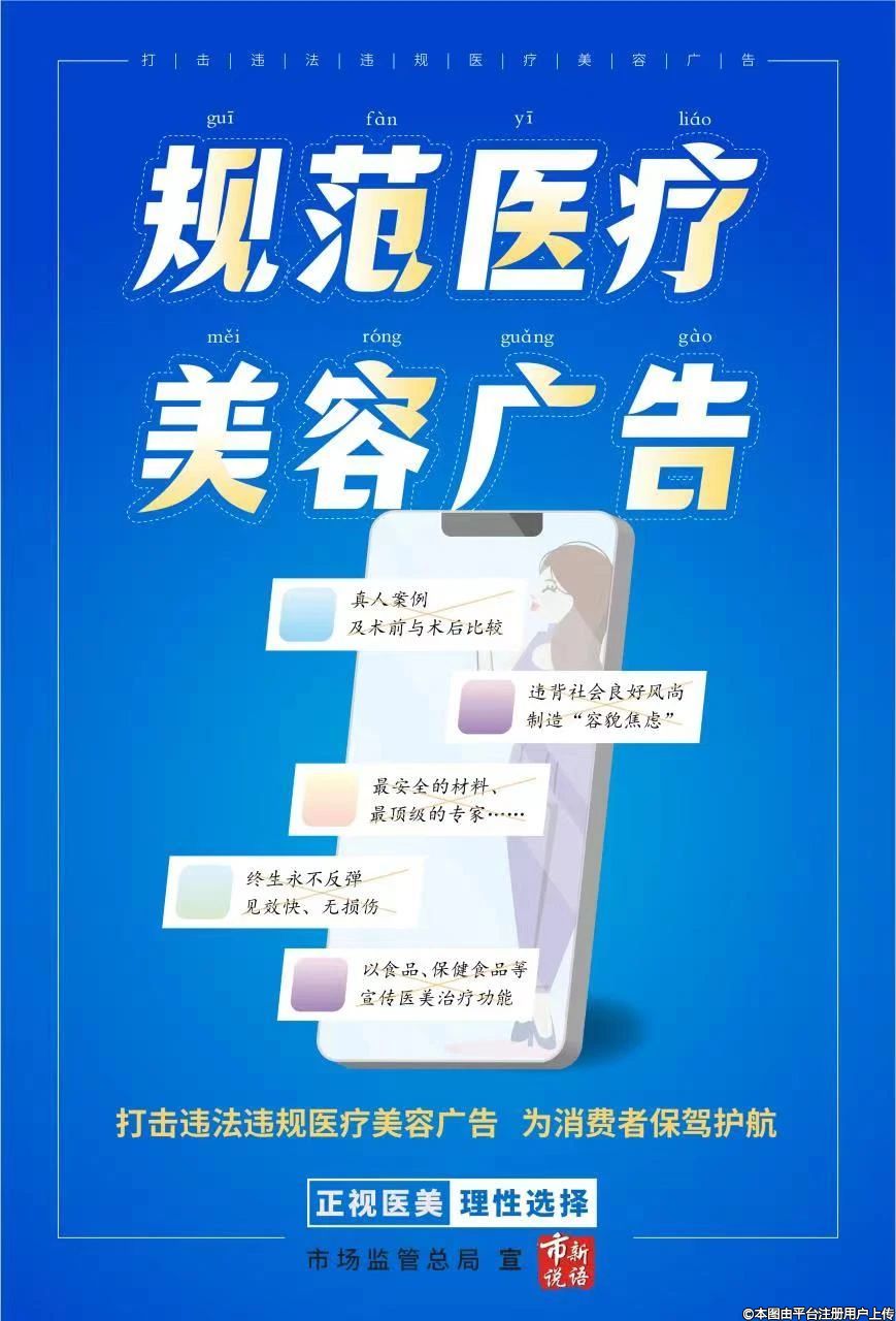 昨日,市場監(jiān)管總局在其微信公眾號(hào)發(fā)布圖片信息:“規(guī)范醫(yī)療美容廣告,打擊違規(guī)違法醫(yī)療美容廣告,為消費(fèi)者保駕護(hù)航”。