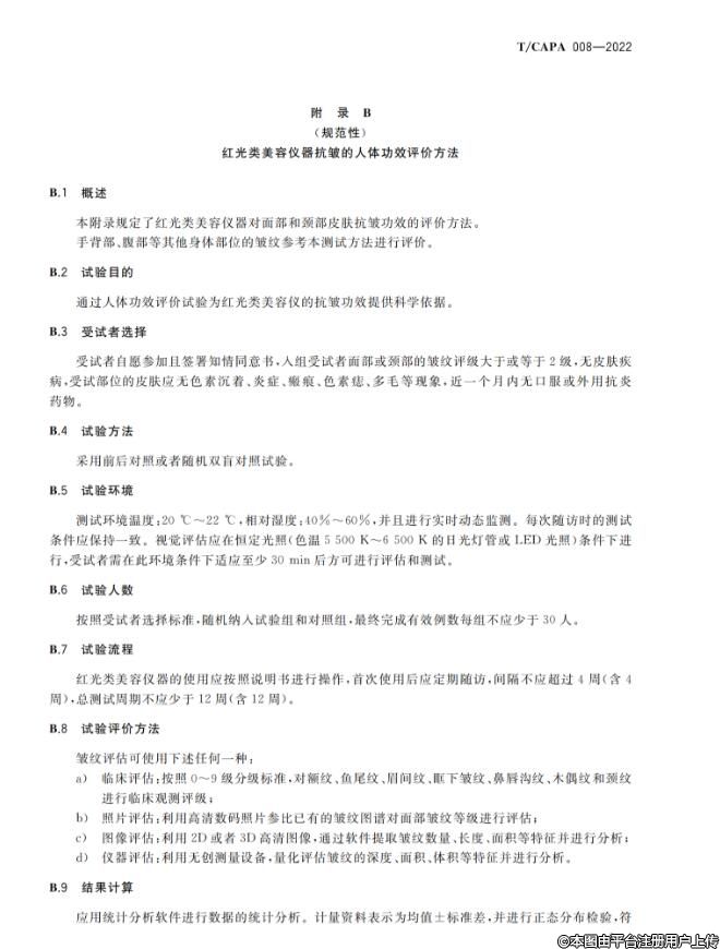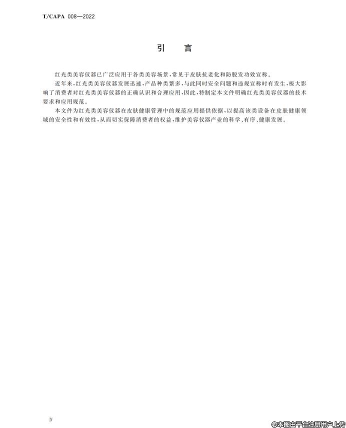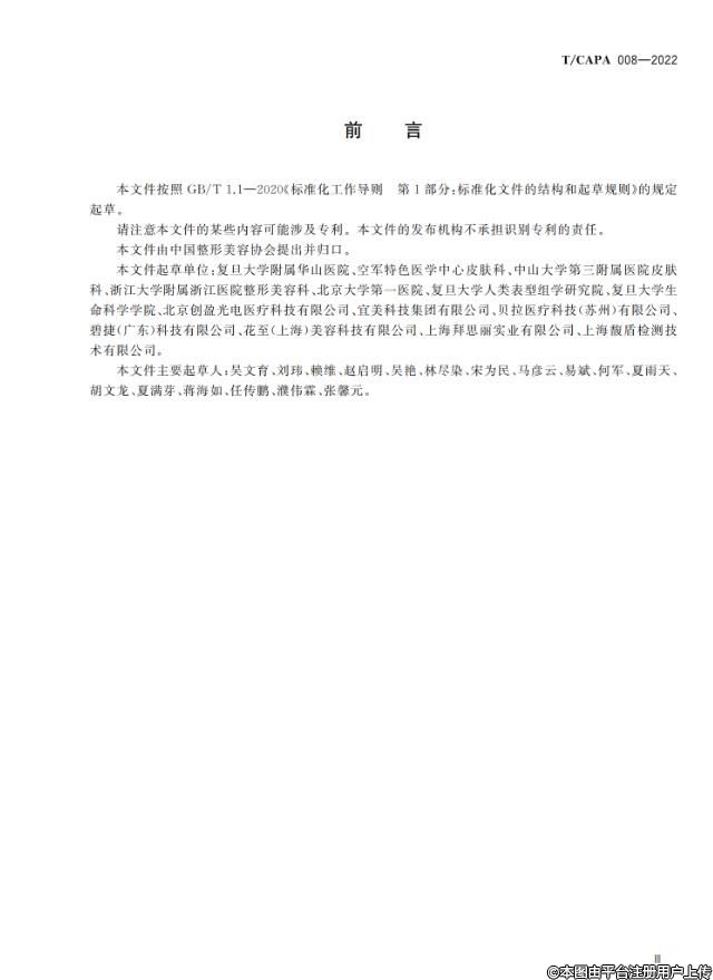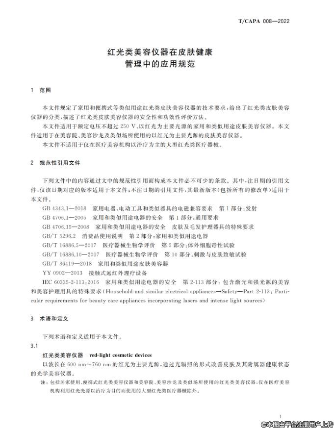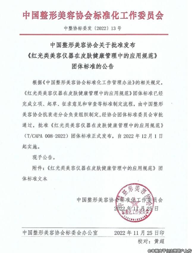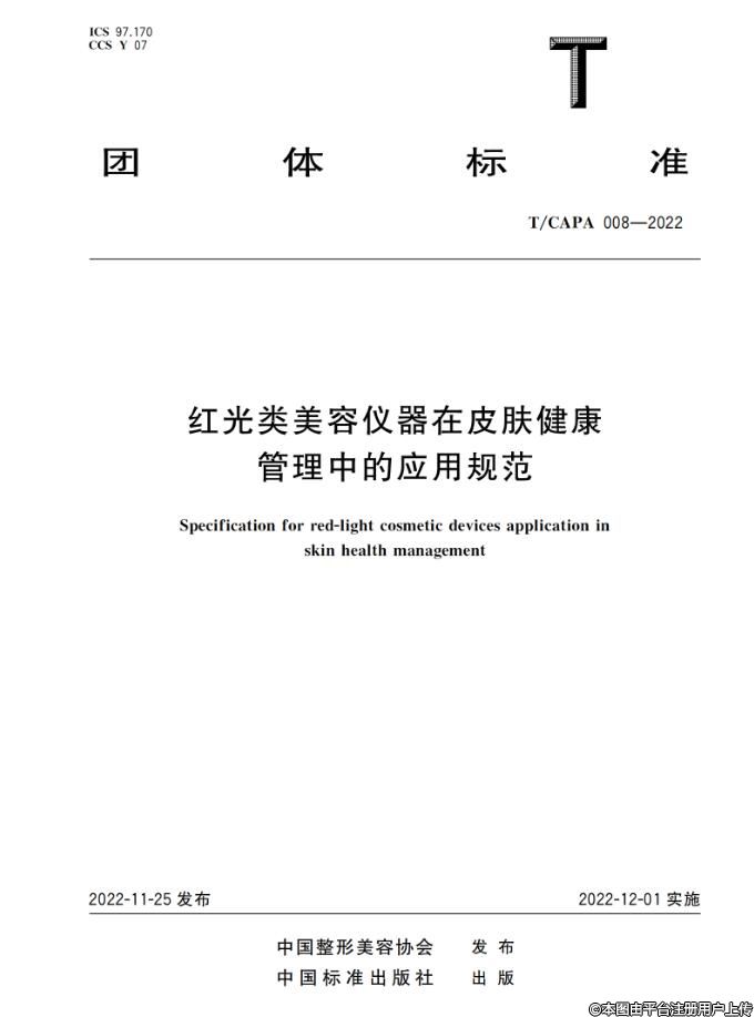 根據(jù)《中國整形美容協(xié)會標準化工作管理辦法》的相關(guān)規(guī)定,《紅光類美容儀器在皮膚健康管理中的應(yīng)用規(guī)范》團體標準已經(jīng)完成立項、起草、征求意見和審查等標準制定流程,由中國整形美容協(xié)會抗衰老分會負責組織制定,經(jīng)協(xié)會團體標準委員會審批通過,批準《紅光類美容儀器在皮膚健康管理中的應(yīng)用規(guī)范》(T/CAPA 008-2022)團體標準正式發(fā)布,自2022年12月1日起實施。