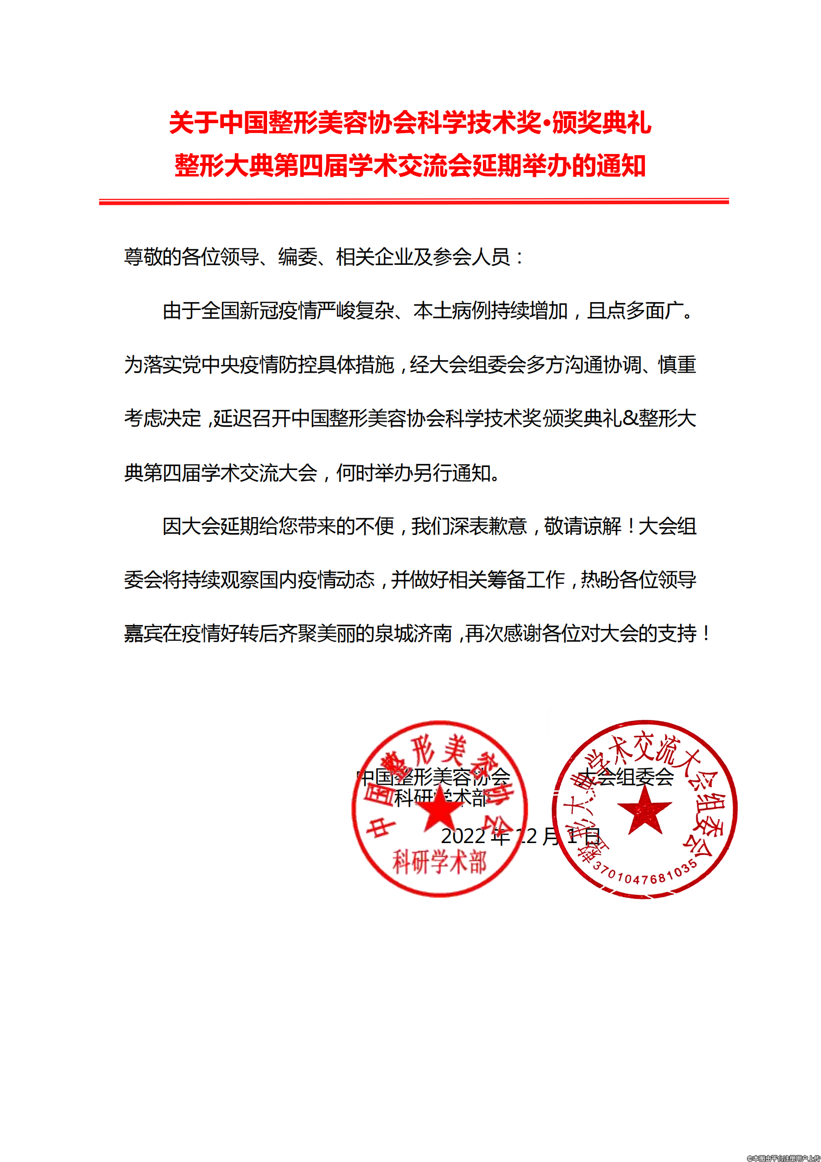 由于全國新冠疫情嚴(yán)峻復(fù)雜、本土病例持續(xù)增加,且點(diǎn)多面廣。為落實(shí)黨中央疫情防控具體措施,經(jīng)大會組委會多方溝通協(xié)調(diào)、慎重考慮決定,延遲召開中國整形美容協(xié)會科學(xué)技術(shù)獎頒獎典禮&整形大典第四屆學(xué)術(shù)交流大會,何時舉辦另行通知。