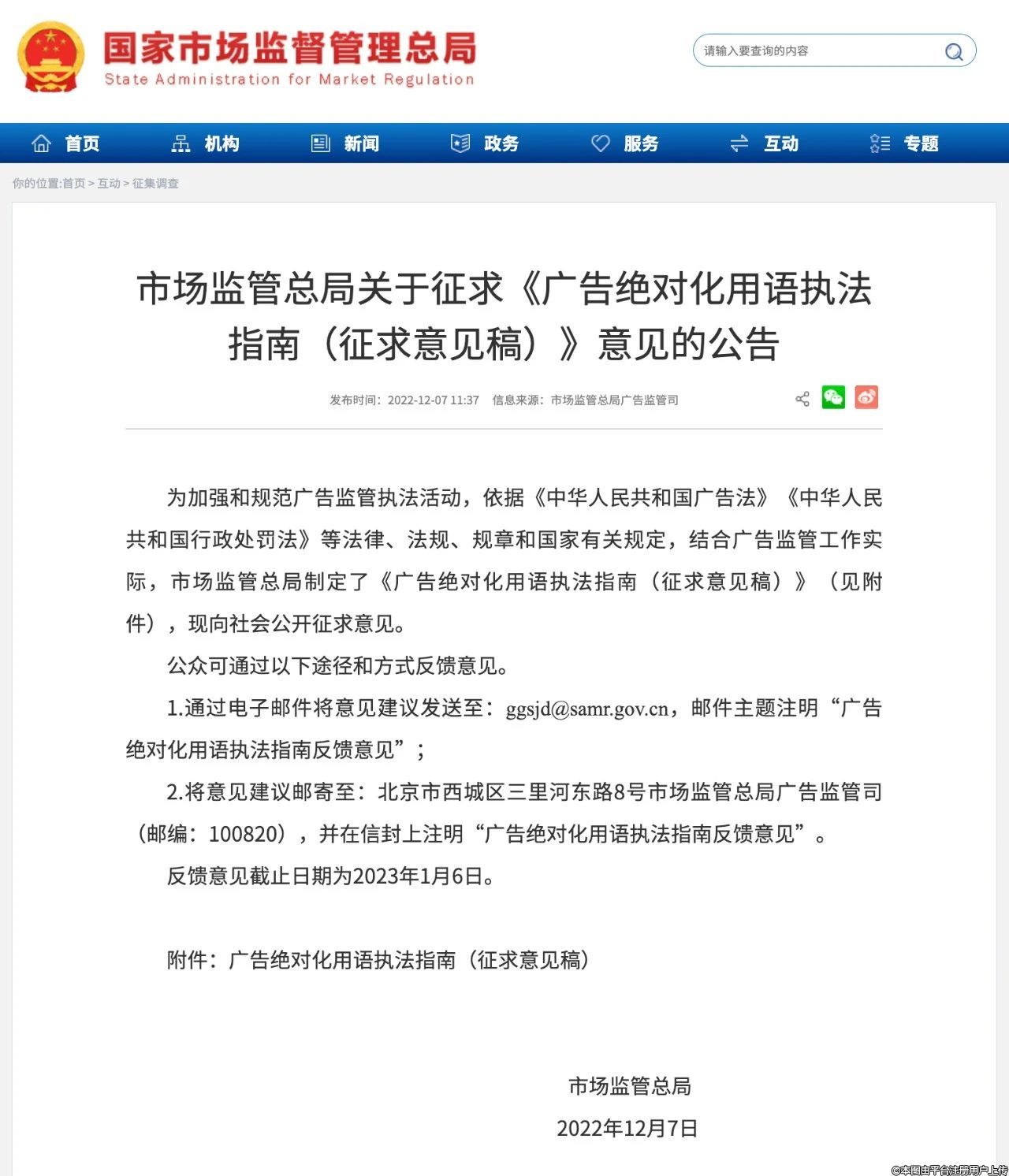 為加強和規(guī)范廣告監(jiān)管執(zhí)法活動,依據(jù)《中華人民共和國廣告法》《中華人民共和國行政處罰法》等法律、法規(guī)、規(guī)章和國家有關(guān)規(guī)定,結(jié)合廣告監(jiān)管工作實際,市場監(jiān)管總局制定了《廣告絕對化用語執(zhí)法指南(征求意見稿)》(見附件),現(xiàn)向社會公開征求意見。