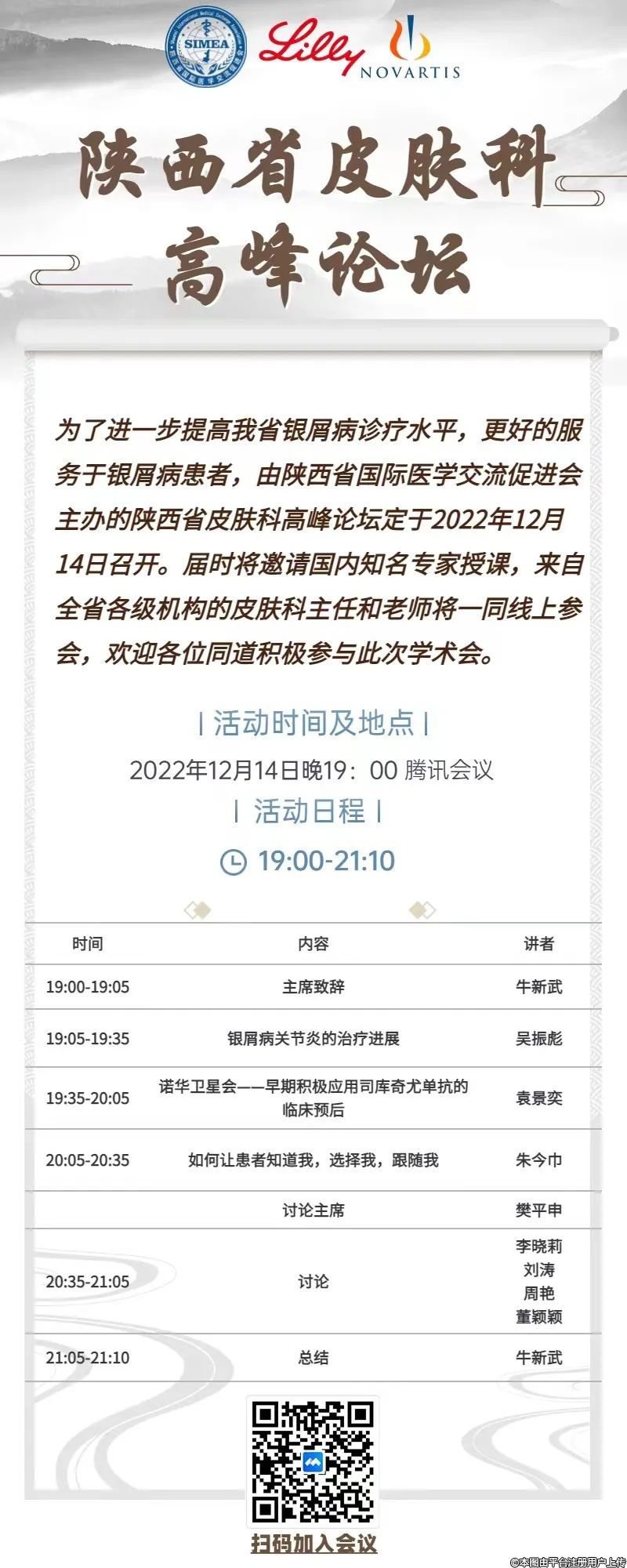 為了進(jìn)一步提高陜西省銀屑病的診療水平,更好的服務(wù)于銀屑病患者,由陜西省國(guó)際醫(yī)學(xué)交流促進(jìn)會(huì)主辦的陜西省皮膚科高峰論壇定于2022年12月14日召開(kāi)。屆時(shí)將邀請(qǐng)國(guó)內(nèi)知名專(zhuān)家授課,來(lái)自全省各級(jí)機(jī)構(gòu)的皮膚科主任和老師將一同線上參會(huì),歡迎各位專(zhuān)家同道參加此次學(xué)術(shù)盛會(huì)。現(xiàn)將會(huì)議有關(guān)事項(xiàng)通知如下: