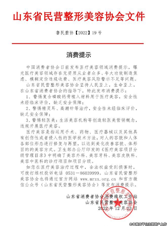 在山東省消費者協(xié)會的指導(dǎo)下,山東省民營整形美容協(xié)會發(fā)布了消費提示: