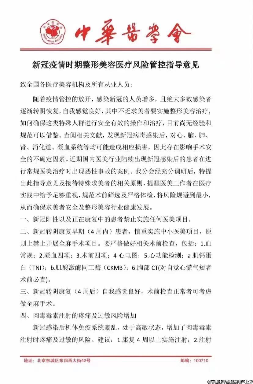 近日,中華醫(yī)學(xué)會(huì)醫(yī)美分會(huì)發(fā)給全國(guó)醫(yī)美機(jī)構(gòu)及所有從業(yè)人員的《新冠疫情時(shí)期整形美容醫(yī)療風(fēng)險(xiǎn)管控指導(dǎo)意見》提出,“新冠陽性以及正在康復(fù)中的患者禁止實(shí)施任何醫(yī)美項(xiàng)目”;新冠轉(zhuǎn)陰康復(fù)早期(4周內(nèi))患者,慎重實(shí)施中小醫(yī)美項(xiàng)目,原則上禁止開展全麻手術(shù)項(xiàng)目。