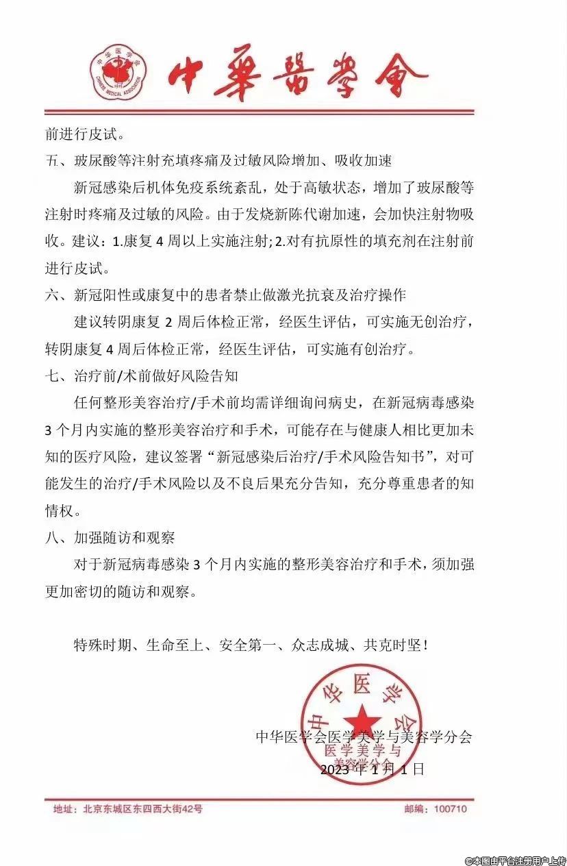 中華醫(yī)學(xué)會(huì)醫(yī)學(xué)美學(xué)與美容學(xué)分會(huì)副主任委員宋建星介紹,新冠大范圍感染后,有陽康病人做醫(yī)美項(xiàng)目后出現(xiàn)了嚴(yán)重并發(fā)癥,給醫(yī)美行業(yè)敲了警鐘。暫不能確定感染新冠和醫(yī)美項(xiàng)目間的具體排斥原因,但為了醫(yī)療安全,分會(huì)向全國(guó)醫(yī)美機(jī)構(gòu)進(jìn)行提醒。