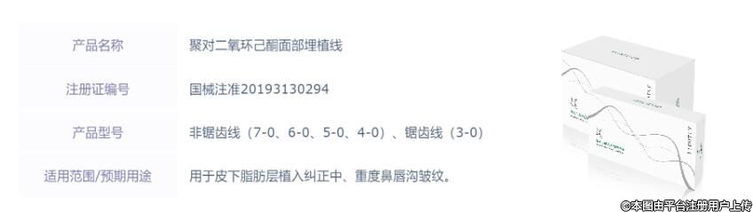 值得一提的,愛美客的“聚對二氧環(huán)己酮面部埋植線(商品名:TIGHTLY緊戀)”已于2019年5月獲得NMPA批準,成為國內(nèi)首張獲批上市的,用于皮下脂肪層植入糾正中、重度鼻唇溝皺紋的安全醫(yī)美材料。“TIGHTLY緊戀”是由聚對二氧環(huán)己酮制成的可吸收單股線,經(jīng)切割而成,染紫色,裝置于導(dǎo)入針當中,并采用固定模塊將外露線頭固定。其中3-0規(guī)格為鋸齒線,4-0以下規(guī)格為非鋸齒線,鋸齒線的鋸齒由刀具切割而成,均朝向同一方向。導(dǎo)入針座裝有手柄模塊。