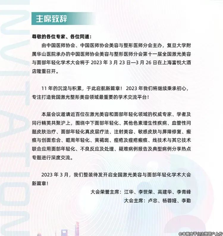由中國(guó)醫(yī)師協(xié)會(huì)、中國(guó)醫(yī)師協(xié)會(huì)美容與整形醫(yī)師分會(huì)主辦,復(fù)旦大學(xué)附屬華山醫(yī)院承辦的第十一屆全國(guó)激光美容與面部年輕化學(xué)術(shù)大會(huì)延期為2023年3月23日-26日在上海富悅大酒店召開(kāi)。