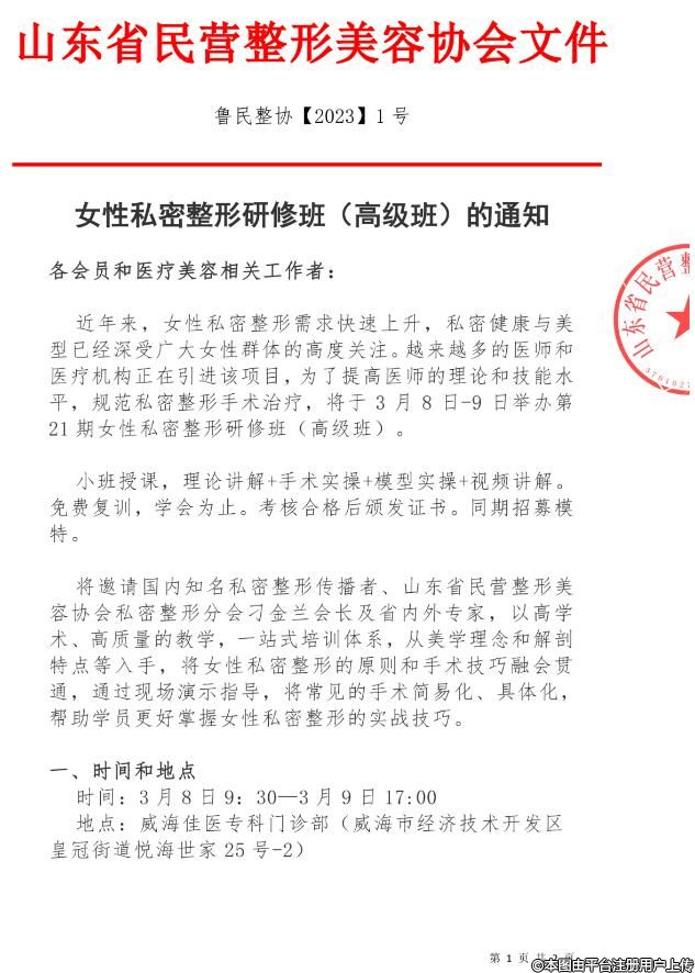 第21期女性私密整形研修班(高級班)將于3月8日-9日在威海舉辦,小班授課,理論講解+手術(shù)實(shí)操+模型實(shí)操+視頻講解。免費(fèi)復(fù)訓(xùn),學(xué)會為止。考核合格后頒發(fā)證書。同期招募模特。