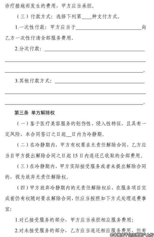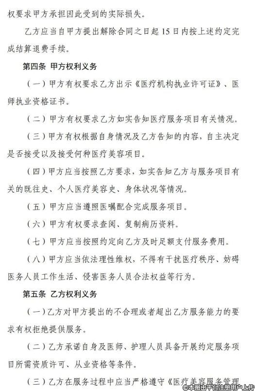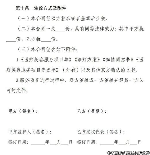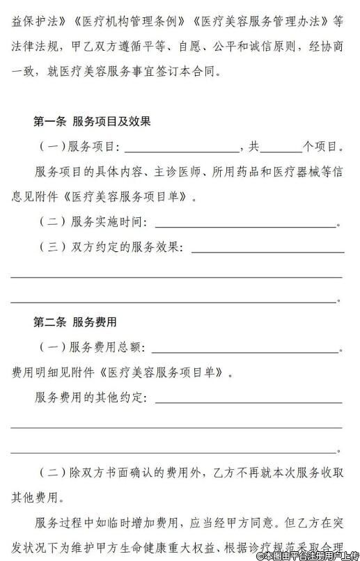 3、合同正文:明確醫(yī)療美容服務(wù)項目名稱、預(yù)期效果、服務(wù)費用、雙方權(quán)利義務(wù)和責(zé)任等;