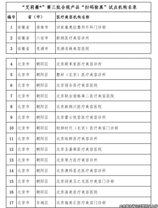 根據(jù)通知中“掃碼驗真試點機(jī)構(gòu)”入選標(biāo)準(zhǔn)及流程,截至2023年8月31日審核通過108家醫(yī)療美容機(jī)構(gòu)為第三批合規(guī)產(chǎn)品“掃碼驗真試點機(jī)構(gòu)”(具體名單見附件)?,F(xiàn)予以公布。
