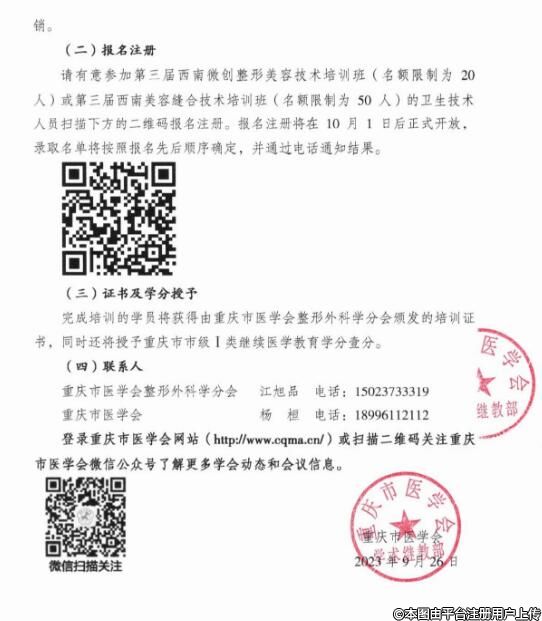 請(qǐng)有意參加第三屆西南微創(chuàng)整形美容技術(shù)培訓(xùn)班(名額限制為20人)或第三屆西南美容縫合技術(shù)培訓(xùn)班(名額限制為50人)的衛(wèi)生技術(shù)人員掃描下方的二維碼報(bào)名注冊(cè)。報(bào)名注冊(cè)將在10月1日后正式開(kāi)放,錄取名單將按照?qǐng)?bào)名先后順序確定,并通過(guò)電話通知結(jié)果。