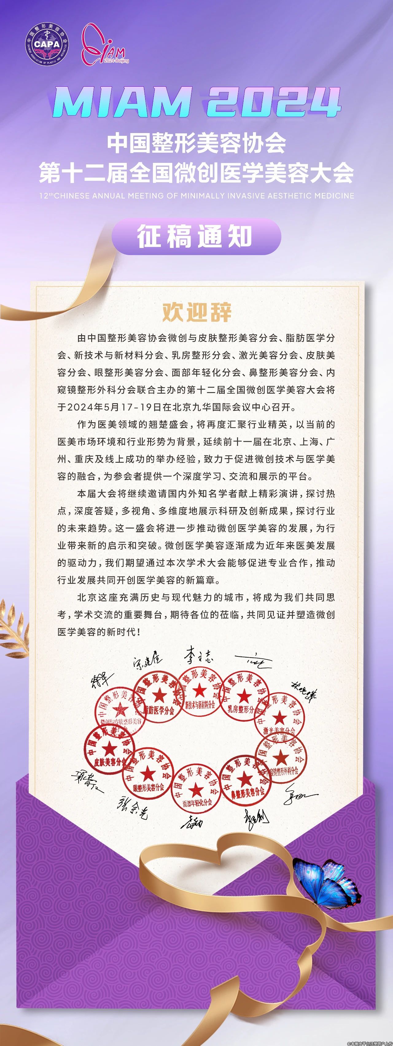 由中國整形美容協(xié)會微創(chuàng)與皮膚整形美容分會、脂肪醫(yī)學(xué)分會、新技術(shù)與新材料分會、乳房整形分會、激光美容分會、皮膚美容分會、眼整形美容分會、面部年輕化分會、鼻整形美容分會、內(nèi)窺鏡整形外科分會聯(lián)合主辦的第十二屆全國微創(chuàng)醫(yī)學(xué)美容大會將于2024年5月17-19日在北京九華國際會議中心召開。
