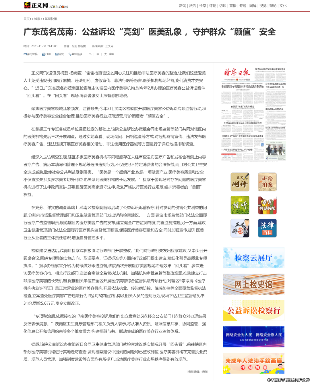 11月30日,正義網以《廣東茂名茂南:公益訴訟“亮劍”醫(yī)美亂象 ,守護群眾“顏值”安全》為題,報道了茂南區(qū)人民檢察院“開展醫(yī)療美容公益訴訟專項監(jiān)督行動”工作做法。原文如下: