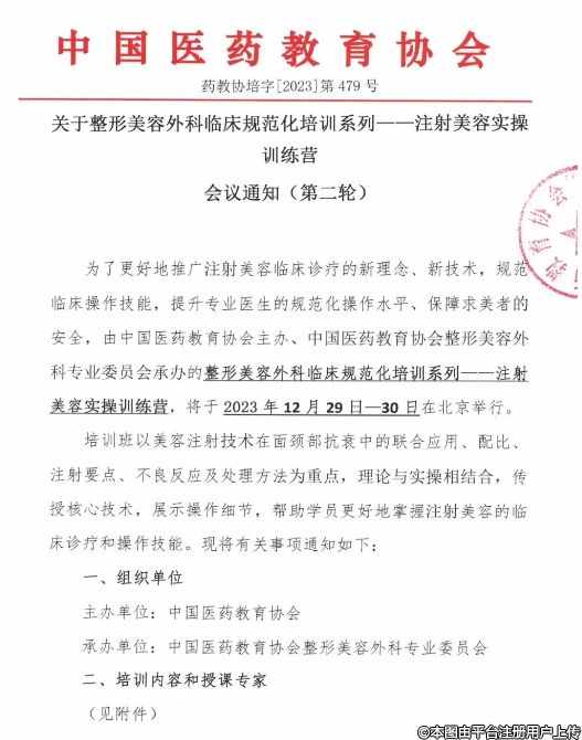 為了更好地推廣注射美容臨床診療的新理念、新技術(shù),規(guī)范臨床操作技能,提升專業(yè)醫(yī)生的規(guī)范化操作水平、保障求美者的安全,由中國醫(yī)藥教育協(xié)會主辦、中國醫(yī)藥教育協(xié)會整形美容外科專業(yè)委員會承辦的注射美容臨床規(guī)范化實(shí)操訓(xùn)練營,將于2023年12月29日—30日在北京舉行。