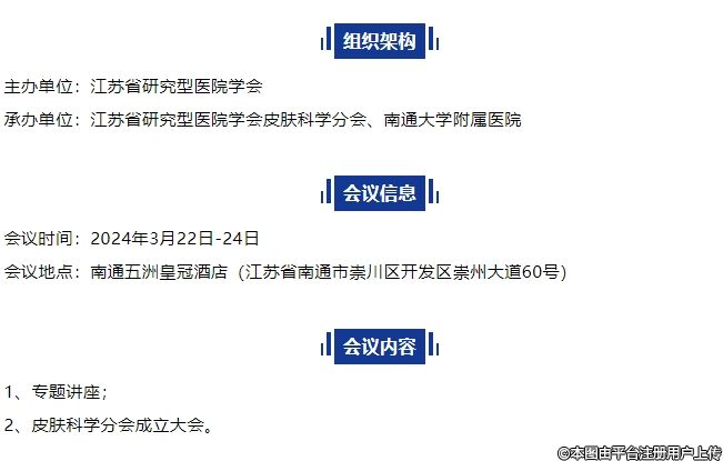 為全面提升江蘇省各級(jí)醫(yī)院皮膚科學(xué)專業(yè)醫(yī)療技術(shù)水平和服務(wù)質(zhì)量,健全江蘇省皮膚科醫(yī)師隊(duì)伍的建設(shè)和管理追蹤皮膚科學(xué)領(lǐng)域新進(jìn)展,擬于2024年3月22日-24日在南通五洲皇冠酒店召開“皮膚科學(xué)分會(huì)第一屆年會(huì)暨皮膚科學(xué)分會(huì)成立大會(huì)”。本次會(huì)議將邀請(qǐng)全國(guó)皮膚科學(xué)領(lǐng)域的著名專家授課并召開皮膚科學(xué)分會(huì)成立大會(huì)參會(huì)人員200人。歡迎皮膚科醫(yī)師參會(huì)。
