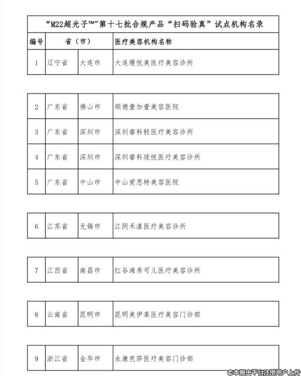 根據(jù)通知中“掃碼驗(yàn)真試點(diǎn)機(jī)構(gòu)”入選標(biāo)準(zhǔn)及流程,截至2024年3月31日審核通過9家醫(yī)療美容機(jī)構(gòu)為第十七批合規(guī)產(chǎn)品“掃碼驗(yàn)真試點(diǎn)機(jī)構(gòu)”(具體名單見附件)。現(xiàn)予以公布。