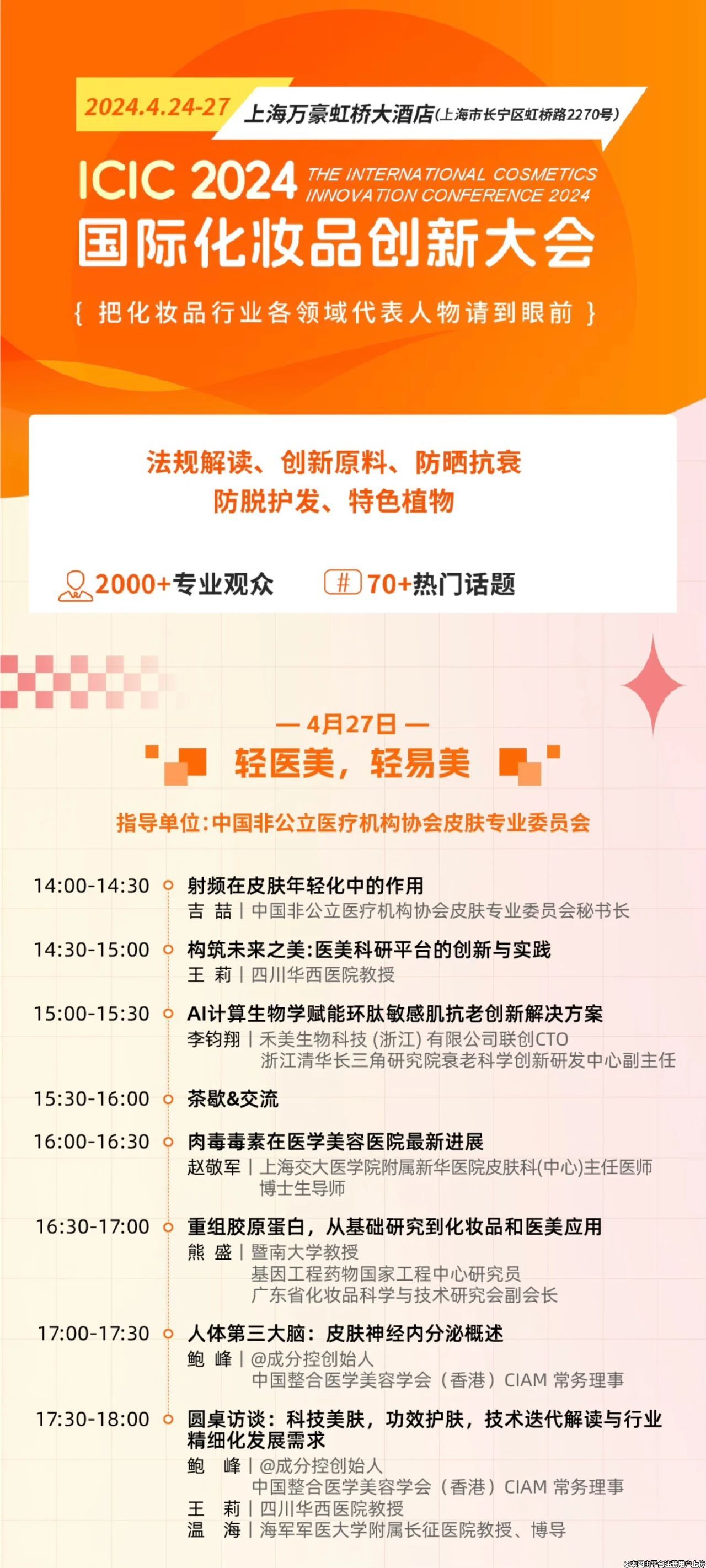2024國際化妝品創(chuàng)新大會由ICIC作為主辦單位,中國非公立醫(yī)療機構(gòu)協(xié)會皮膚專業(yè)委員會作為指導單位,匯聚了多位化妝品及皮膚行業(yè)內(nèi)專家,以及多位化妝品品牌方代表出席大會。