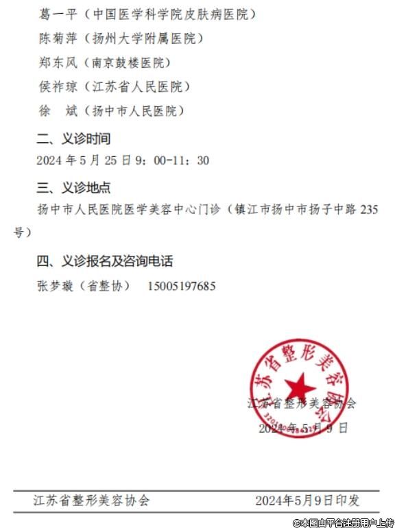 為貫徹落實黨中央健康中國戰(zhàn)略和國務(wù)院《全民科學(xué)素質(zhì)行動計劃綱要》,發(fā)揮協(xié)會為民服務(wù)的宗旨,利用協(xié)會專家資源,為基層提供醫(yī)療技術(shù)支持,推動當(dāng)?shù)蒯t(yī)學(xué)科學(xué)發(fā)展和人才培養(yǎng),提高當(dāng)?shù)厝嗣袢罕姷慕】狄庾R和健康水平,由江蘇省整形美容協(xié)會主辦、江蘇省整形美容協(xié)會面部年輕化分會、揚中市人民醫(yī)院聯(lián)合承辦的專家義診定于2024年5月25日在揚中舉辦,歡迎各位同仁的關(guān)注和參加。義診安排如下: