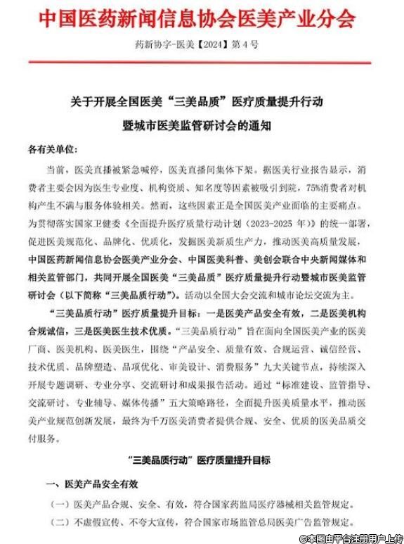 當(dāng)前,醫(yī)美直播被緊急喊停,醫(yī)美直播間集體下架。據(jù)醫(yī)美行業(yè)報(bào)告顯示,消費(fèi)者主要會(huì)因?yàn)獒t(yī)生專業(yè)度、機(jī)構(gòu)資質(zhì)、知名度等因素被吸引到院,75%消費(fèi)者對(duì)機(jī)構(gòu)產(chǎn)生不滿與服務(wù)體驗(yàn)相關(guān)。然而,這些因素正是全國(guó)醫(yī)美產(chǎn)業(yè)面臨的主要痛點(diǎn)。為貫徹落實(shí)國(guó)家衛(wèi)健委《全面提升醫(yī)療質(zhì)量行動(dòng)計(jì)劃(2023-2025年)》的統(tǒng)一部署,促進(jìn)醫(yī)美規(guī)范化、品牌化、優(yōu)質(zhì)化,發(fā)掘醫(yī)美新質(zhì)生產(chǎn)力,推動(dòng)醫(yī)美高質(zhì)量發(fā)展,中國(guó)醫(yī)藥新聞信息協(xié)會(huì)醫(yī)美產(chǎn)業(yè)分會(huì)、中國(guó)醫(yī)美科普、美創(chuàng)會(huì)聯(lián)合中央新聞媒體和相關(guān)監(jiān)管部門,共同開展全國(guó)醫(yī)美“三美品質(zhì)醫(yī)療質(zhì)量提升行動(dòng)暨城市醫(yī)美監(jiān)管研討會(huì)(以下簡(jiǎn)稱“三美品質(zhì)行動(dòng)”)。