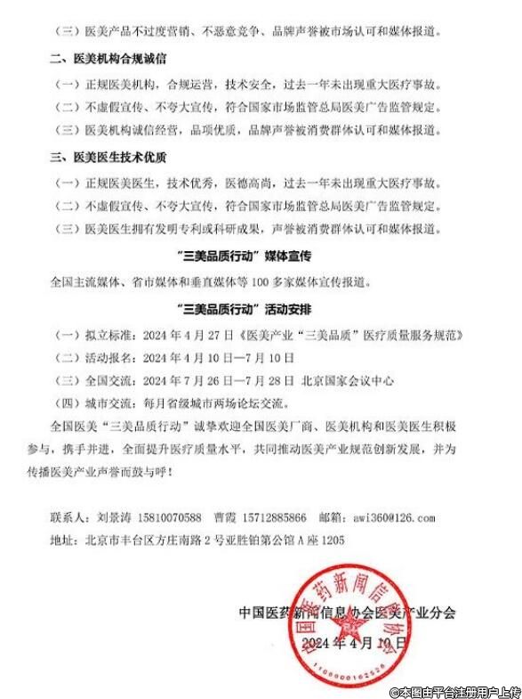 中國(guó)醫(yī)藥新聞信息協(xié)會(huì)醫(yī)美產(chǎn)業(yè)分會(huì)、中國(guó)醫(yī)美科普、美創(chuàng)會(huì)聯(lián)合中央新聞媒體和相關(guān)監(jiān)管部門,共同開展全國(guó)醫(yī)美“三美品質(zhì)”醫(yī)療質(zhì)“量提升行動(dòng)暨城市醫(yī)美監(jiān)管研討會(huì)(簡(jiǎn)稱美品質(zhì)行動(dòng)”)。