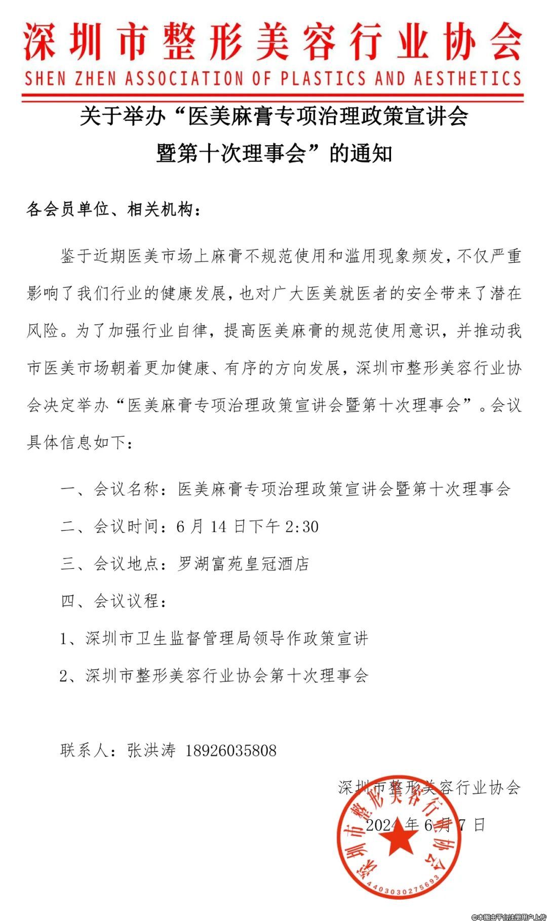 鑒于近期醫(yī)美市場上麻膏不規(guī)范使用和濫用現(xiàn)象頻發(fā),不僅嚴重影響了我們行業(yè)的健康發(fā)展,也對廣大醫(yī)美就醫(yī)者的安全帶來了潛在風險。為了加強行業(yè)自律,提高醫(yī)美麻膏的規(guī)范使用意識,并推動我市醫(yī)美市場朝著更加健康、有序的方向發(fā)展,深圳市整形美容行業(yè)協(xié)會決定舉辦“醫(yī)美麻膏專項治理政策宣講會暨第十次理事會”。