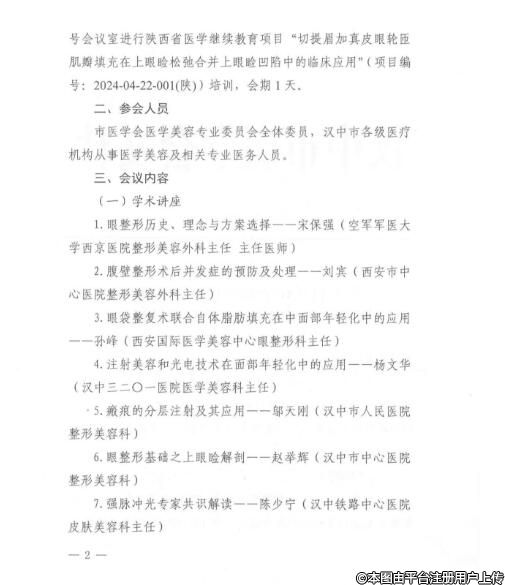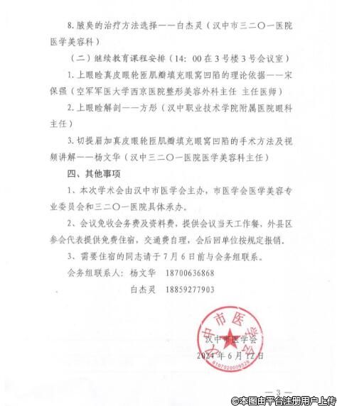 為進一步提升我市各醫(yī)療機構(gòu)醫(yī)學美容技術(shù)水平,促進醫(yī)學美容專業(yè)學術(shù)交流,決定召開漢中市醫(yī)學美容專業(yè)學術(shù)會議,同時進行陜西省醫(yī)學繼續(xù)教育項目授課培訓?,F(xiàn)將有關(guān)事項通知如下: