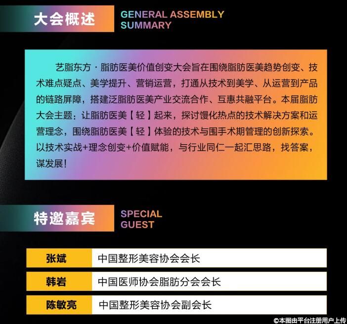 藝脂東方·脂肪醫(yī)美價值創(chuàng)變大會旨在圍繞脂肪醫(yī)美趨勢創(chuàng)變、技術(shù)難點疑點、美學(xué)提升、營銷運營,打通從技術(shù)到美學(xué)、從運營到產(chǎn)品的鏈路屏障,搭建泛脂肪醫(yī)美產(chǎn)業(yè)交流合作、互惠共融平臺。本屆脂肪大會主題:讓脂肪醫(yī)美【輕】起來,探討?zhàn)z化熱點的技術(shù)解決方案和運營理念,圍繞脂肪醫(yī)美【輕】體驗的技術(shù)與圍手術(shù)期管理的創(chuàng)新探索。以技術(shù)實戰(zhàn)+理念創(chuàng)變+價值賦能,與行業(yè)同仁一起匯思路,找答案謀發(fā)展!