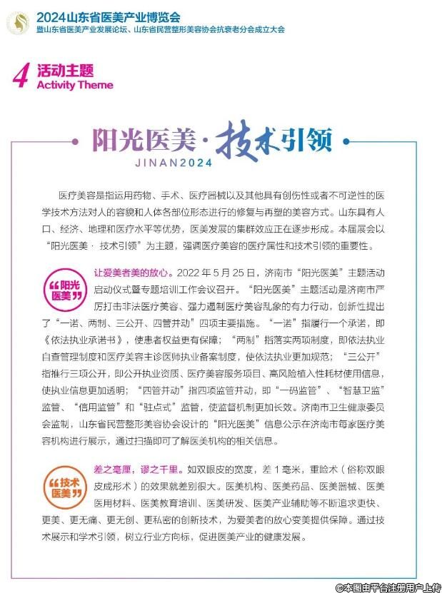 2024中國(guó)國(guó)際大健康產(chǎn)業(yè)博覽會(huì)將于2024年9月12日至14日在山東國(guó)際會(huì)展中心舉行,山東省醫(yī)美產(chǎn)業(yè)博覽會(huì)作為重要板塊之一,將推動(dòng)醫(yī)美行業(yè)的健康發(fā)展,提升行業(yè)的整體形象和服務(wù)水平。本次博覽會(huì)上,擬將舉辦山東省醫(yī)美產(chǎn)業(yè)高質(zhì)量發(fā)展論壇、山東省民營(yíng)整形美容協(xié)會(huì)抗衰老分會(huì)成立大會(huì)等,邀請(qǐng)全國(guó)各地的醫(yī)美專家和企業(yè)代表通過(guò)主題演講、技術(shù)研討等形式相聚一堂,共同探討了醫(yī)美行業(yè)的技術(shù)發(fā)展趨勢(shì)。
