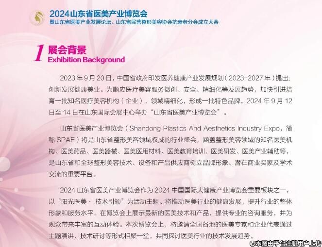 山東省醫(yī)美產(chǎn)業(yè)博覽會(huì)(簡(jiǎn)稱SPAE)是山東省整形美容領(lǐng)域權(quán)威的行業(yè)盛會(huì),涵蓋整形美容領(lǐng)域的知名醫(yī)美機(jī)構(gòu)、醫(yī)美藥品、醫(yī)美器械、醫(yī)美醫(yī)用材料、醫(yī)美教育培訓(xùn)、醫(yī)美研發(fā)、醫(yī)美產(chǎn)業(yè)輔助等,是山東省和全球整形美容技術(shù)、設(shè)備和產(chǎn)品供應(yīng)商樹(shù)立品牌形象、潛在商業(yè)買家及學(xué)術(shù)交流的重要平臺(tái)。