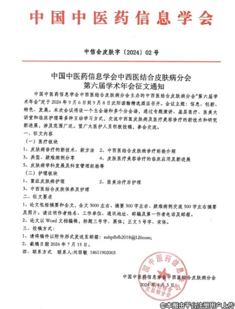 中國中醫(yī)藥信息學(xué)會(huì)中西醫(yī)結(jié)合皮膚病分會(huì)主辦的第六屆全國學(xué)術(shù)年會(huì)定于2024年9月6日—9月8日在沈陽召開。
