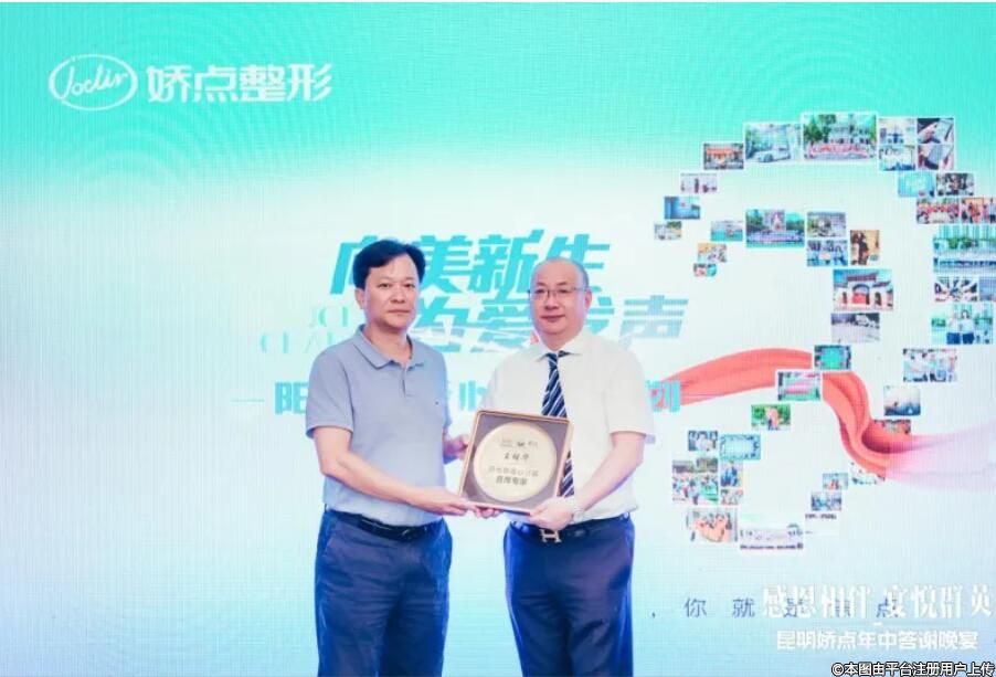 嬌點醫(yī)療集團總院長姜宇祿向云南省整形美容協(xié)會創(chuàng)傷修復整形美容分會會長昆明醫(yī)科大學第二附屬醫(yī)院整形外科主任王繼華主任授牌